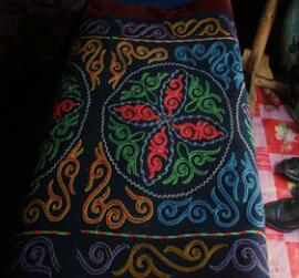 科爾沁刺繡與漢民族刺繡所用底料相比,有自己的特色。漢民族女性喜歡在布料或綢緞上刺繡,特別喜歡軟底的材料。而科爾沁的蒙古族繡女,其刺繡選料更廣一點(diǎn),除去在軟底料上刺繡外,她們還可以在羊毛氈、皮靴等硬面料上刺繡。在這些硬底料上刺繡,是很費(fèi)力的,所用的“繡線”也不一般。漢地和南方的刺繡,多用絲線、紗線,金線、銀線、棉線和絨線,為的是色彩豐富,光澤度好,手感也柔軟,不起毛不褪色。科爾沁的蒙古族的繡娘們,用駝絨線、馬鬃或牛筋線等材料,用這些草原上的特殊“繡線”在硬底料(如駝鞍、馬鞍等)上刺繡出的圖案,質(zhì)感極強(qiáng),猶如浮雕。