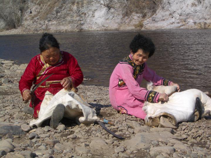 鄂倫春人過去在家庭公社“烏力鄰”里,同生產(chǎn)共消費,在當(dāng)時生產(chǎn)力十分低下的情況下,憑著扎槍和弓箭,單個人很難獲得能夠滿足衣食需要的獵物,必須要有“烏力鄰”全體成員的通力合作,才能戰(zhàn)勝兇猛和龐大的野獸,所以,在“塔坦達”領(lǐng)導(dǎo)下的集體狩獵是當(dāng)時最主要的勞動形式。隨著生產(chǎn)力的不斷發(fā)展和個體小家庭的大量流動,不僅社會組織“烏力鄰”由原來血緣性的家庭公社演變?yōu)榈鼐壭缘牡赜蚬?,勞動組織也隨之發(fā)生了極大的變化。集體狩獵已不再是“烏力鄰”傾巢出動,而是由幾個小家庭的成員自愿結(jié)合成“安嘎”來進行。同時還出現(xiàn)了集體和個人等多種勞動形式。狩獵也不再單純是為了滿足衣食的需要,剩余獵物可以拿去交換,獵產(chǎn)品已趨于商品化。故此時一些珍貴的細毛皮張和藥用價值較高的獸類,成了鄂倫春人主要的狩獵目標。這樣就形成了一年中的四個狩獵旺季,即:農(nóng)歷正月至2月是“鹿胎期”;4月至6月是“鹿茸期”;9月至落雪為“叫鹿尾期”;落雪后至來年開春是“打皮子期”。大概是源于原始的圍獵,鄂倫春人把狩獵叫“打圍”,而這四個狩獵旺季就叫“紅圍期”?!凹t圍期”除“叫鹿尾期”外,都組織“安嘎”集體出獵?!鞍哺隆笔且环N臨時性的狩獵組織,狩獵旺季將臨時,由一人發(fā)起,串聯(lián)幾位親朋好友或志趣相投的人組成一個“安嘎”,待獵期結(jié)束,“安嘎”自行解散,下次出獵時再重新組合,因此其成員并不是固定的(圖為熟化狍皮,吳雅芝攝影)。